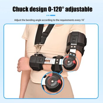1.La codera con bisagras controla el rango de movimiento del codo ajustando la extensión (0° – 60°) y flexión (0° – 120°) del dial ROM en 15° incrementos, evitando la sobreextensión y reduciendo la posibilidad de lesiones.